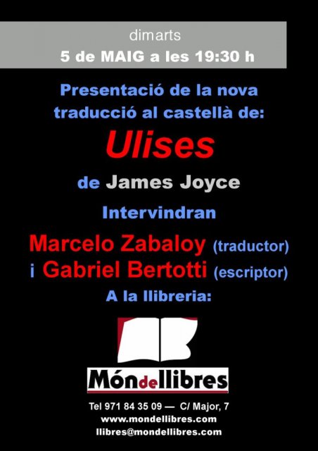 El Lunes 4 de Mayo y el Martes 5, presentaremos junto a Marcelo Zabaloy, su traducción del "Ulises" de James Joyce, en Literanta, en Palma de Mallorca, y en Món de libres, en Manacor.