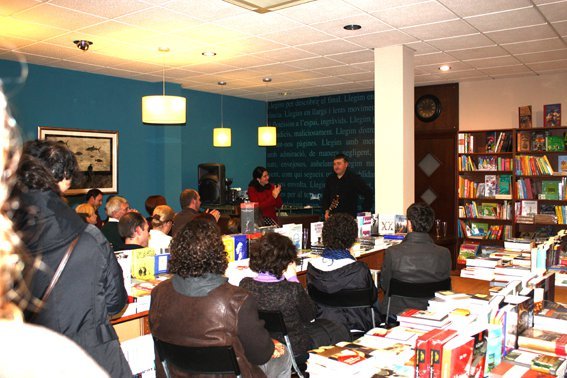 Així de petit quedà el renovat local de la llibreria Món de llibres per escoltar i per sentir Damià Timoner i la seva guitarra. Timoner estigué acompanyat per la filòloga i gerent de la Institució Pública Antoni M. Alcover, Magdalena Gelabert. El guitarrista va fer un repàs dels grans músics del pop-rock que va titular "Nice noises and the dark side".
